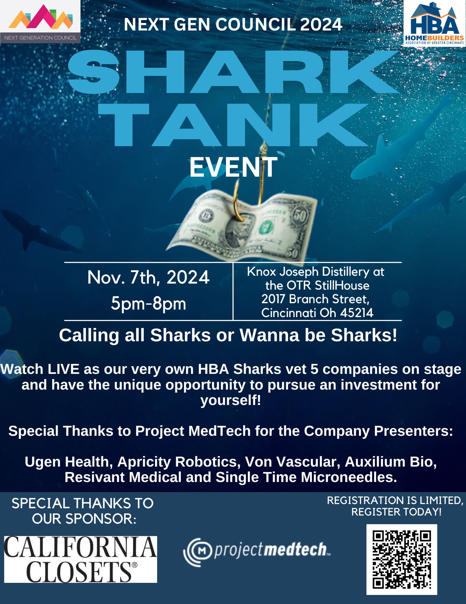 The Next Gen Committee of the Home Builders Association of Cincinnati presents a "Shark Tank" inspired event to support potential medical-based startup companies seeking investment. The event aims to provide a platform for entrepreneurs to pitch their innovative ideas to a panel of our very own HBA Sharks. These Sharks will engage in a Q&A session with the presenting companies, evaluating their business plans, market potential, and growth strategies. Attendees will also have the opportunity to invest in the companies they believe have the most potential for success, fostering a collaborative environment for entrepreneurship and investment in the medical sector.