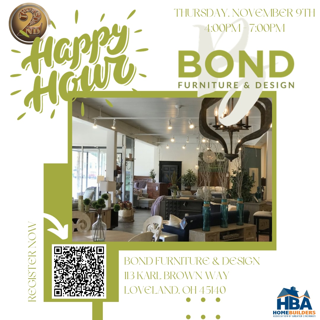 Meet us at Bond Furniture for Happy Hour! Come enjoy complimentary food and drinks while you network and browse some great interior design pieces! Hope to see you there!